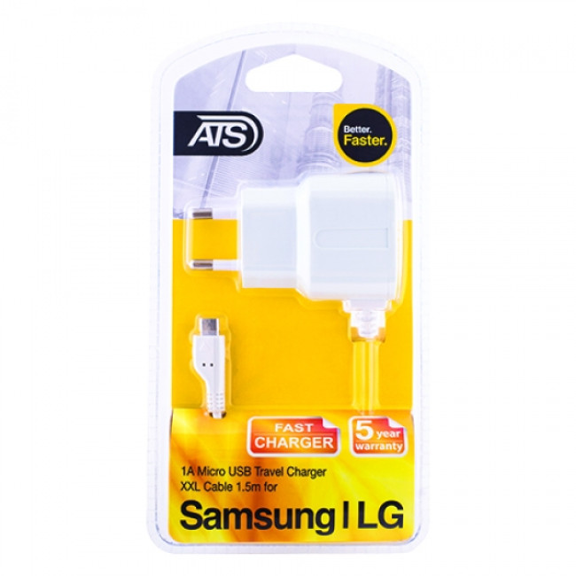 Сетевое зарядное устройство ATS 1A идеально подходит для смартфонов Samsung и Android, а также совместимо со всеми устройствами с разъемом Micro USB. Безусловное преимущество сетевого устройства – 1.5м кабель, который дает Вам больше свободы действий, пока ваш смартфон заряжается. Благодаря компактным размерам, зарядку можно брать с собой в путешествия – она не займет много места и позаботится о том, чтоб ваш смартфон был полностью заряжен.