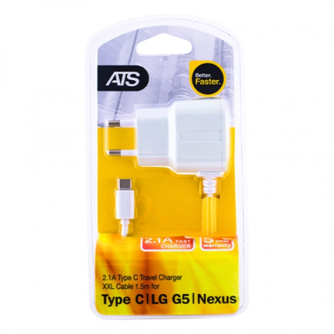 Зарядное устройство ATS 2.1А с разъемом Type-C для устройств LG G5 и Nexus. Встроенный кабель отличается высокой скоростью передачи данных и достигает в длину 1,5 м, так что подключать к питанию устройство можно будет с бóльшего расстояния. Двухсторонний Type-C разъем подключается просто, независимо от того, какой стороной вы вставляете кабель. Надежная конструкция и технология защиты от перезарядки обеспечивают предохраняют от перегрузки по току, перегрева и короткого замыкания.